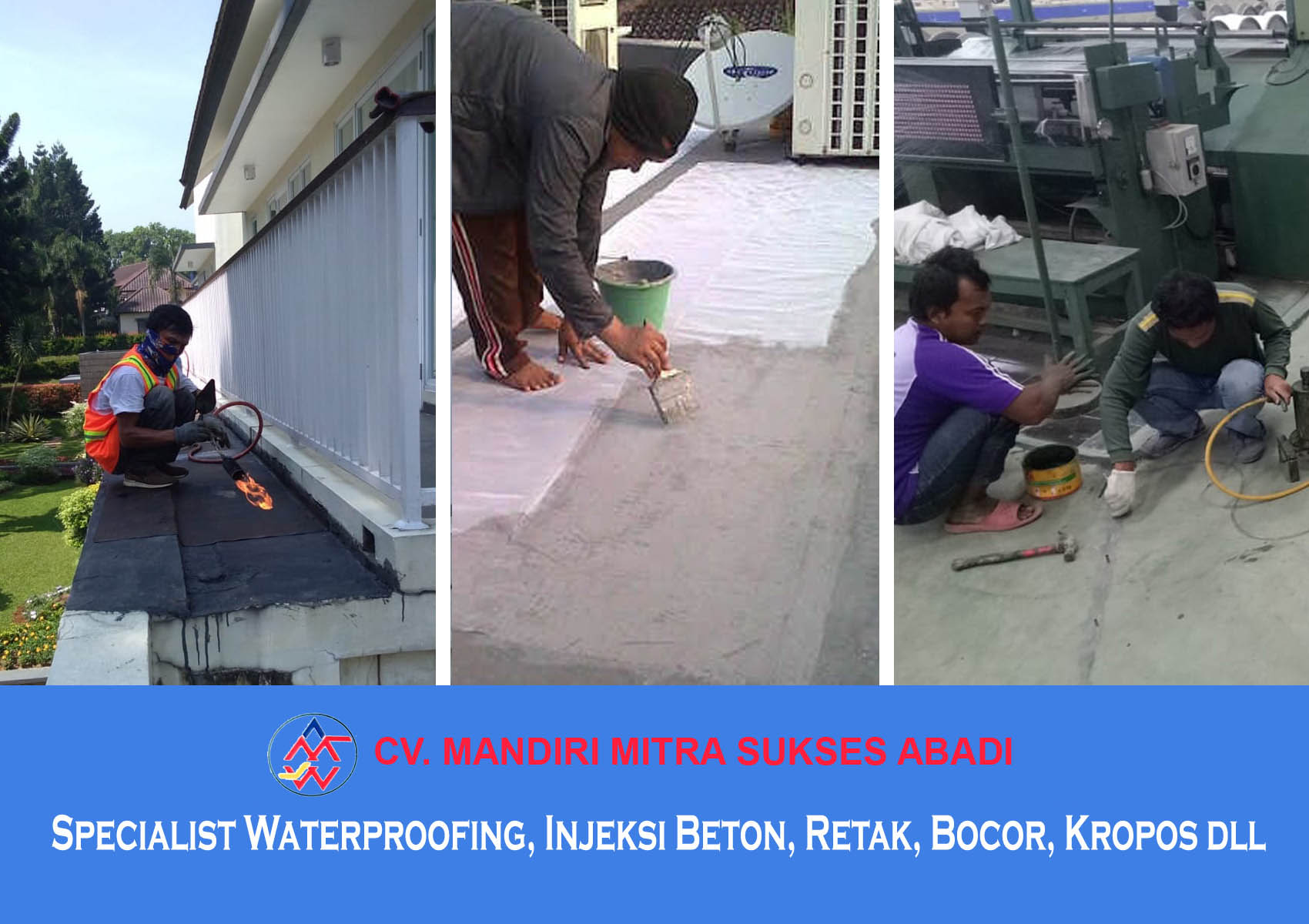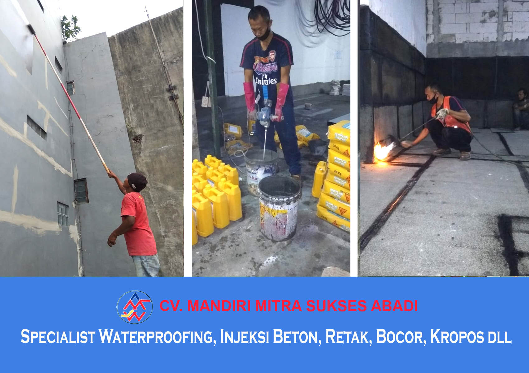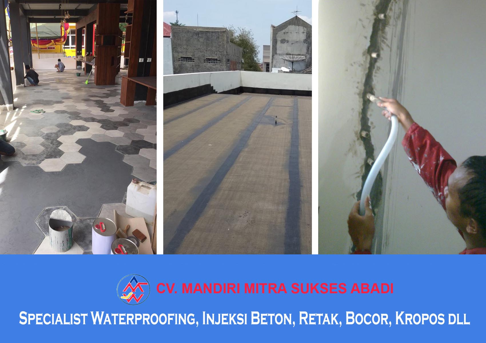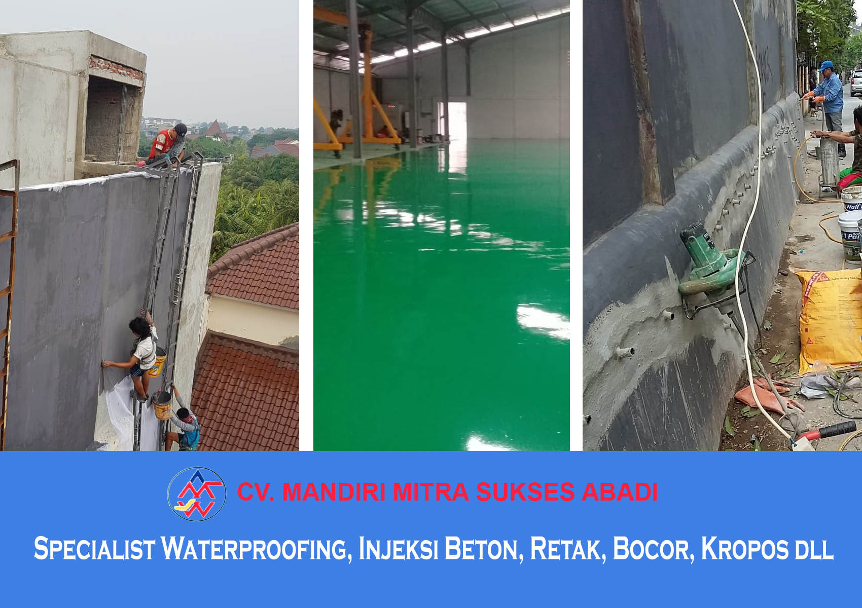 CV. MANDIRI MITRA SUKSES ABADI adalah perusahan yang bergerak dalam bidang specialist Contractor dan Waterproofing Yang sudah sangat berpengalaman dibidang aplikator waterproofing dan Injeksi Beton. Berbagai macam jenis bangunan telah berhasil kami kerjakan baik bangunan baru maupun bangunan lama dengan tenaga kerja kami yang sudah berpengalaman dan dapat dipertanggung jawabkan.